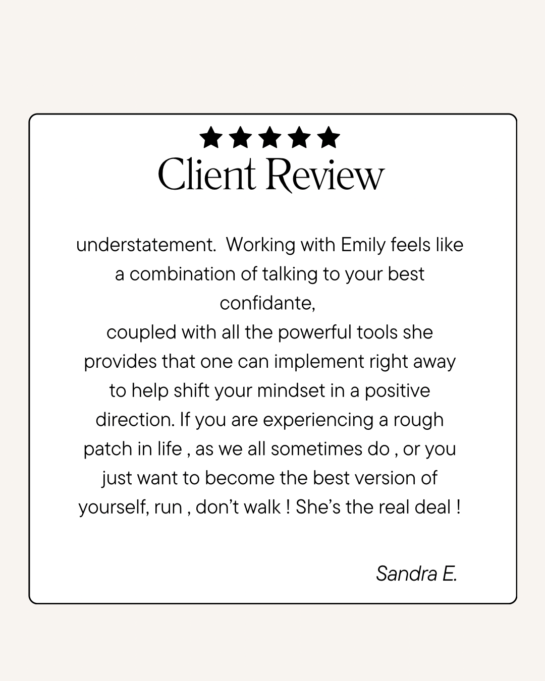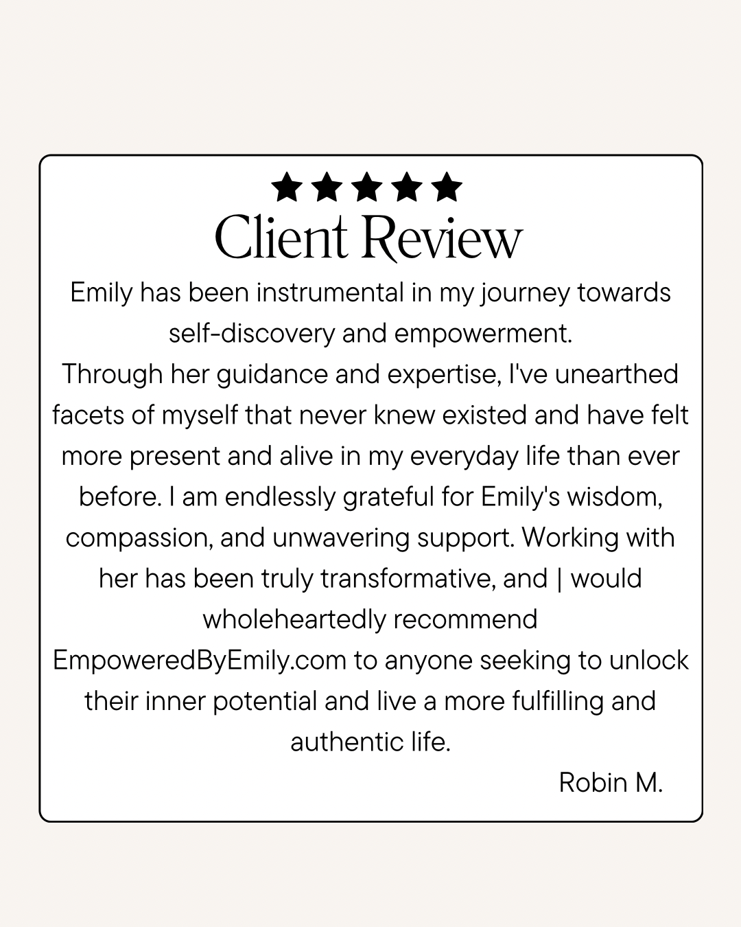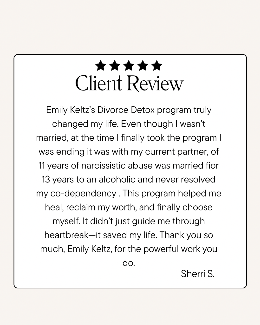 Emily’s mission is personal. After enduring an 18-year toxic marriage marked by narcissistic abuse and gaslighting, she found herself a single mother to three children, struggling to reclaim her identity and self-worth. Through her own healing journey — from emotional bottom to breakthrough — she became master certified and committed to empowering other women to rise faster and stronger than she had to. Today, happily remarried and thriving, Emily is living proof that reinvention is possible at any age. Her Divorce Detox program is the roadmap she wishes she had. It offers a compassionate, step-by-step plan and strategy to nourish the heart, rebuild soul aligned confidence, and open the door to the love and life every woman deserves.